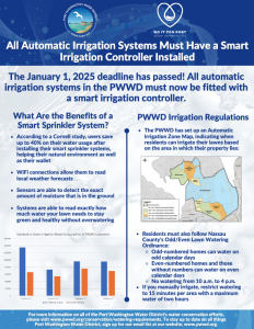 If this applies to you, please fill out the form below. That way, we know that you plan to have your smart controller installed this year and do not need further reminders from the PWWD. If you have any questions, please feel free to reach out to us at 516-767-0171 or via email at info@pwwd.org.