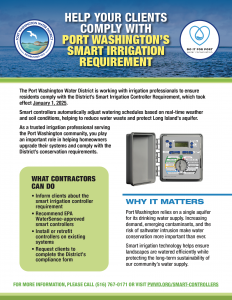 Irrigation professionals serving the Port Washington community play an important role in helping homeowners upgrade their systems and comply with the District’s conservation requirements.