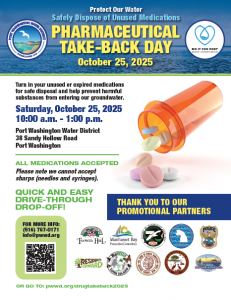 Our seventh annual Pharmaceutical Drug Take-Back Day will be held Saturday, October 25 from 10 a.m. to 1 p.m. at our headquarters located at 38 Sandy Hollow Road. This annual event was established in 2018 to provide residents on the Port Washington Peninsula with a safe way to dispose of their expired or unused prescription drugs. Keeping these potentially harmful substances out of the water supply prevents adverse effects on human health.